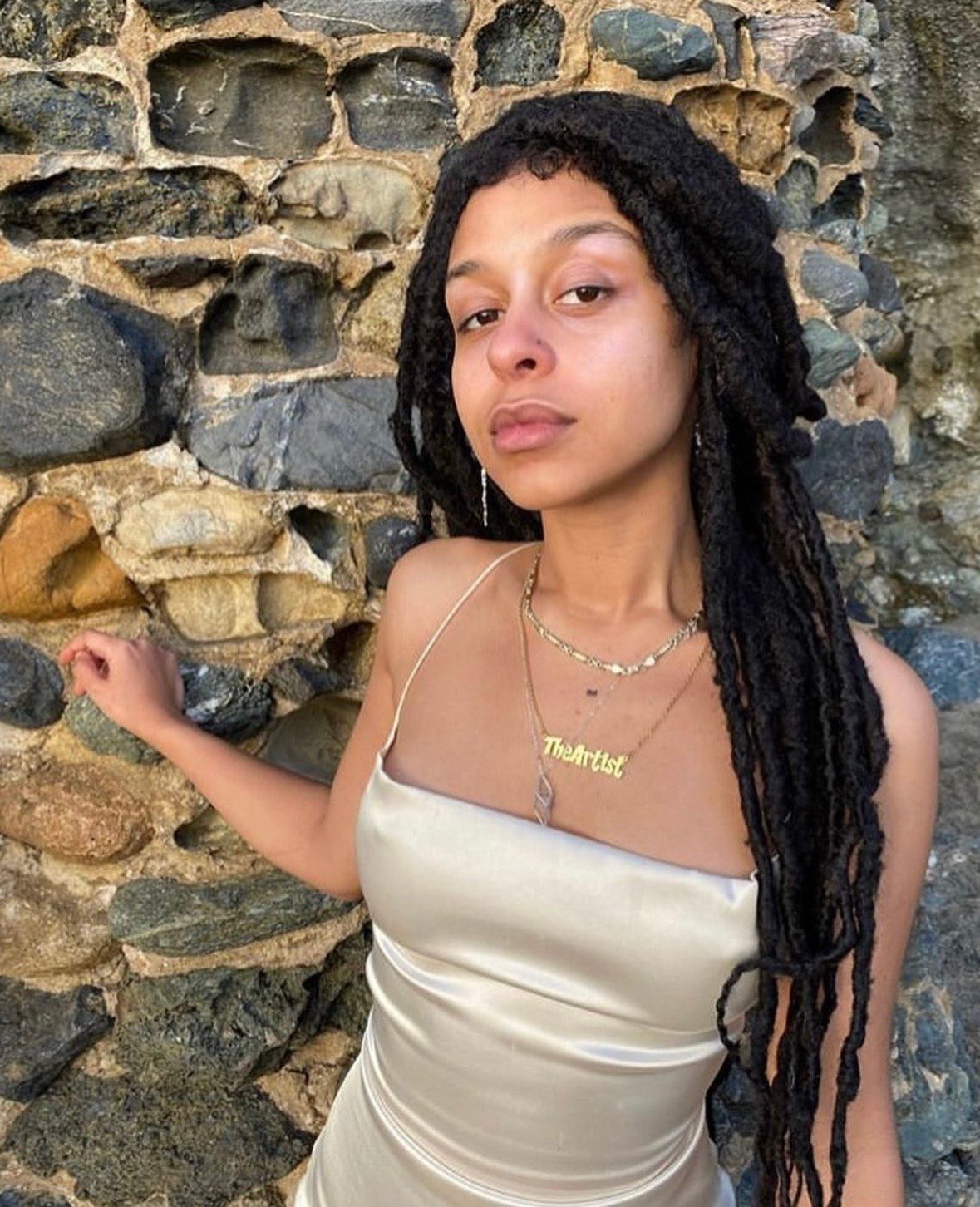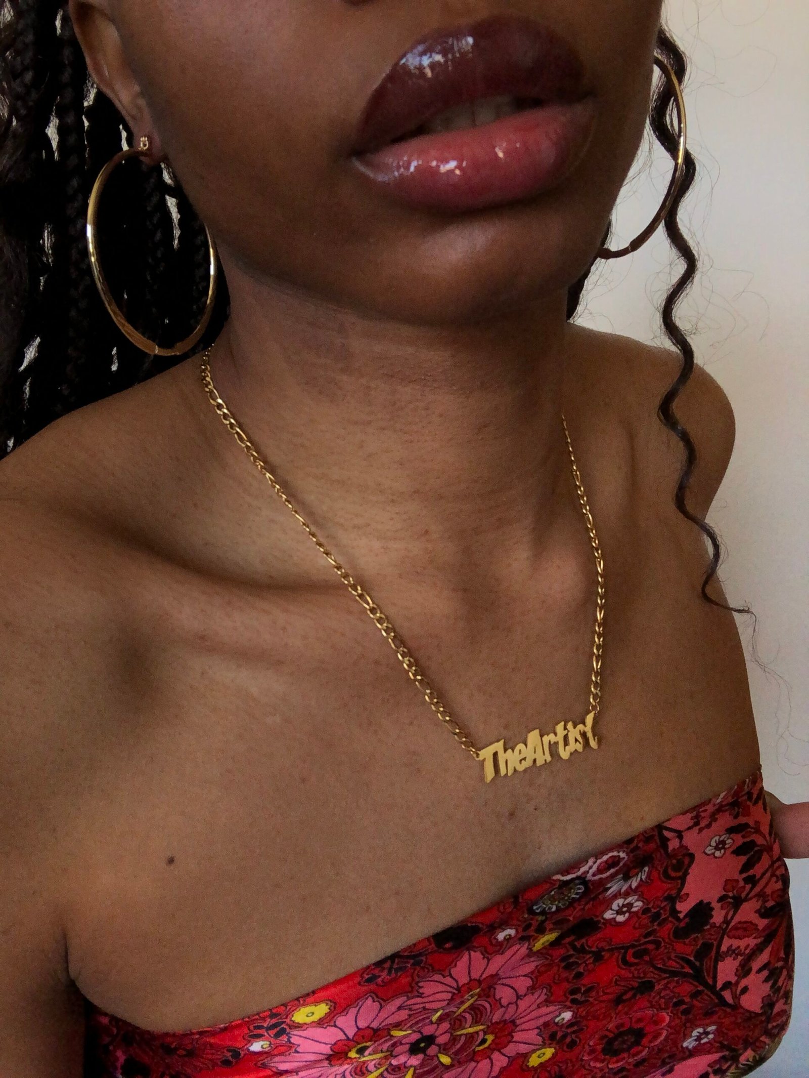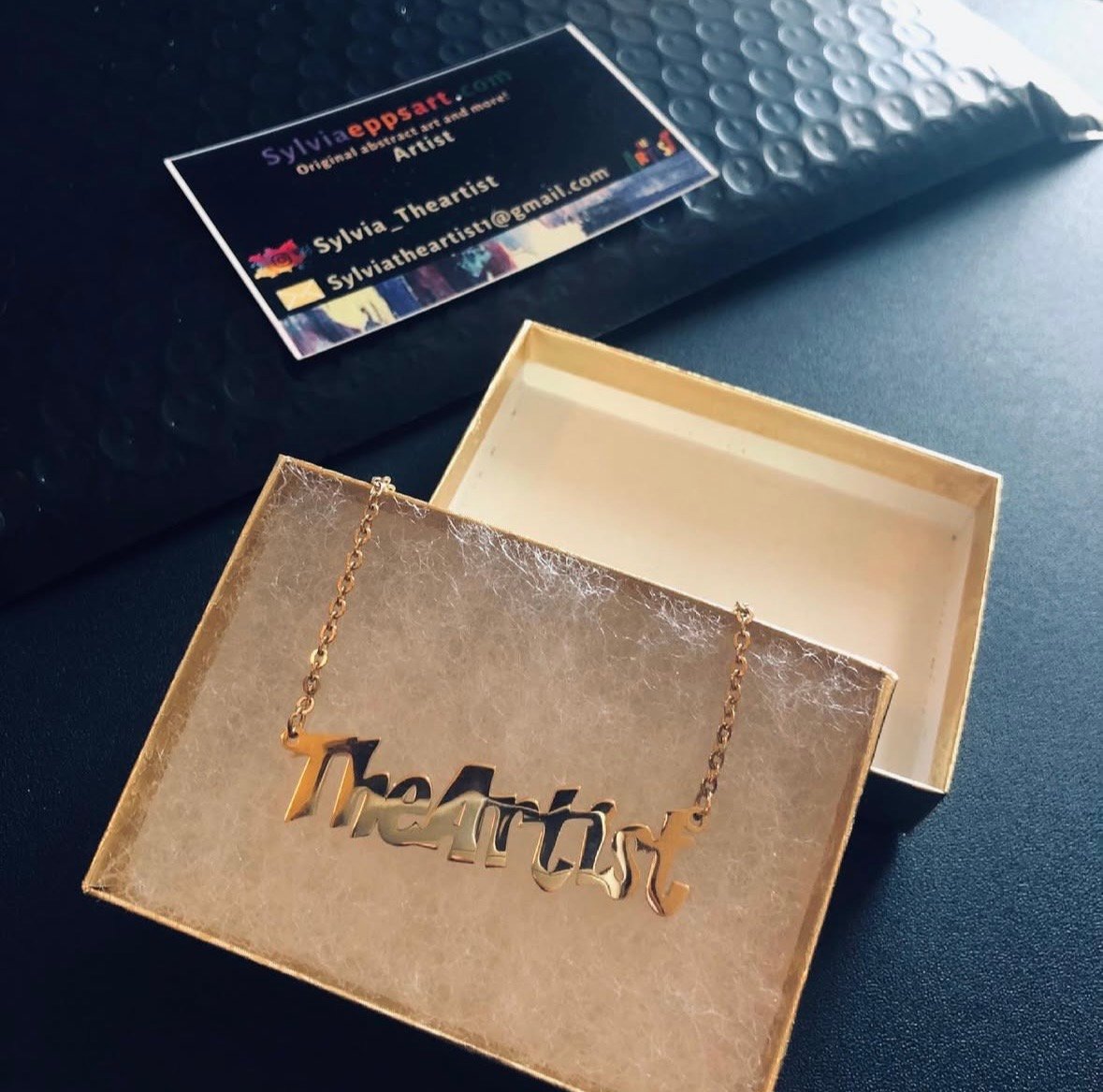 The neckless reads “The Artist” In Gold font